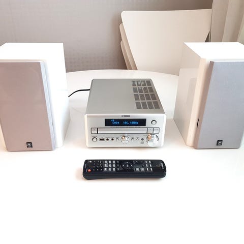 Tivoli Audio Model Two med tillbehör, inklusive en radioenhet, en extra högtalare, en CD-spelare och en subwoofer.