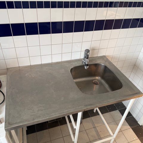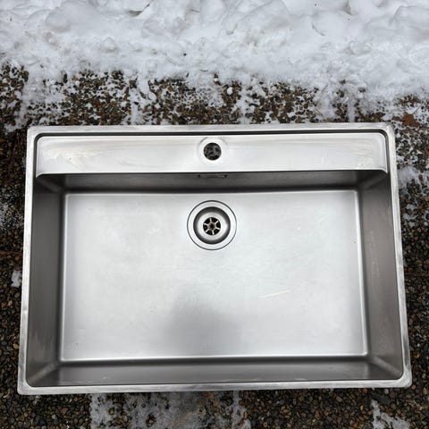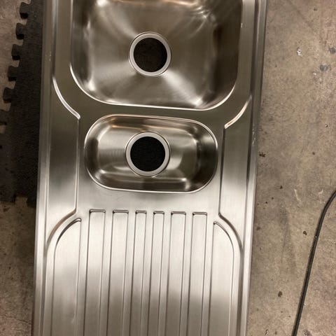 Diskho med dubbla hoar i rostfritt stål. Det finns ett färdigt hål för blandare. Undersidan visar anslutet vattenlås och avloppsrör i plast.