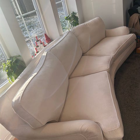 Säljer vår Englesson Howard Medium-soffa. Den är välanvänd och har en del slitage – sittdynorna är nedsjunkna och tyget har bleknader samt någon mindre fläck. Avtagbar klädsel på dynorna.
