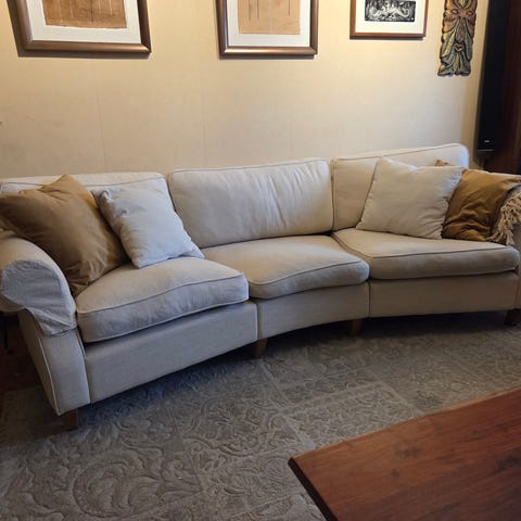 Väldigt fin howardsoffa (3 sittkuddar, 3 ryggkuddar) i ljusgrå klädsel. En klassisk, lättsvängd, väldigt vacker och elegant howard soffa med stilrena utsvängande ben som avslutas med metal hjul! Soffan är i väldigt bra skick och utan skador eller fläckar. Klädseln på kuddarna är avtagbar och väl rengjorda inför försäljningen!