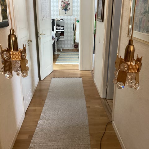 Kristall taklampa/fönsterlampa i mässingsfärgad metall med klara prismor. Lampan hängs upp i kedja från taket. Konstruktionen består av en central lamphållare omgiven av flera rader prismor som ger ett ljusspel när lampan är tänd. Passar exempelvis i fönster hall, sovrum eller ovanför matbord. Mått enligt bild med måttband, höjd på lamphuvud inklusive lamphållare.