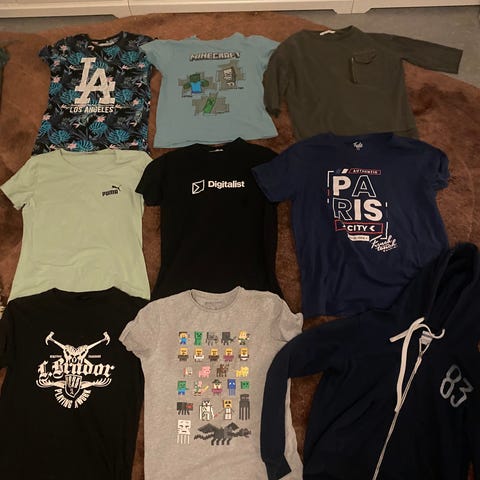 Blandade kläder för pojke i storlek 152. Paketet innehåller 7 par byxor, 4 par shorts, 3 tjocktröjor, 5 T-shirts och en kortärmad shorts. Kläderna är i gott skick