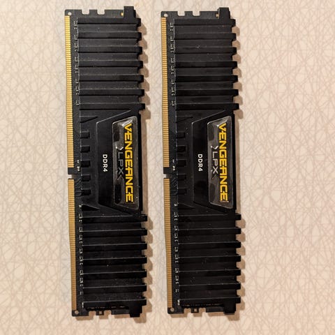 Corsair Vengeance LPX RAM-minne DDR4 för stationär dator. Modulerna är utrustade med svart kylfläns och är av typen DDR4. Passar moderkort som stödjer DDR4-minne och Vengeance LPX-serien. Lämpligt för uppgradering eller utbyggnad av arbetsminne i kompatibla system. Exakta kapacitets- och hastighetsspecifikationer bör kontrolleras mot modellbeteckningen på etiketten eller i tillverkarens dokumentation.