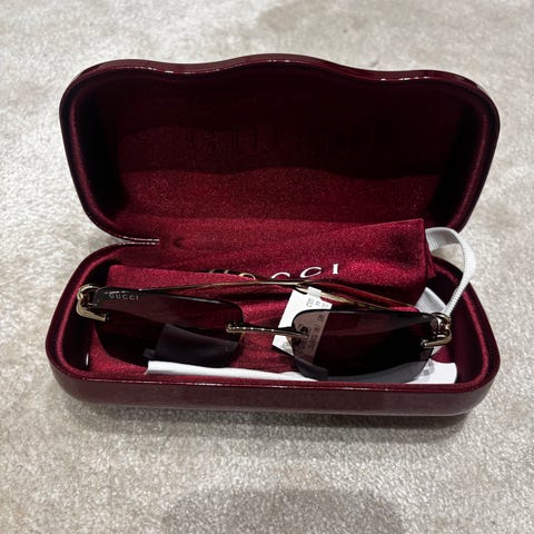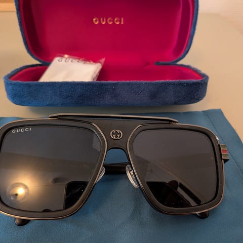 Gucci solglasögon unisex (mest för herr då storleken är 56mm). Med bruntonade linser och metallbåge. Förvaringsfodral och putsduk från Gucci ingår enligt bild samt kvitto.