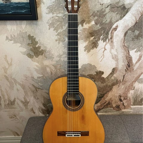 Skick: Otroligt originalskick. Rak hals, bra stränghöjd och fin finish. Jag har inte spelat på många år och den förvarats noggrant, jag har inte bekymrat mig att köpa nya strängar så det saknas ett par stycken. Finns en liten skråma och det är den enda defekten jag kan hitta.