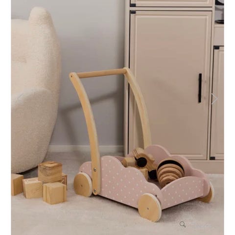 Klassisk lära-gå-vagn i trä med tillhörande klossar.