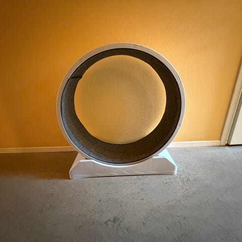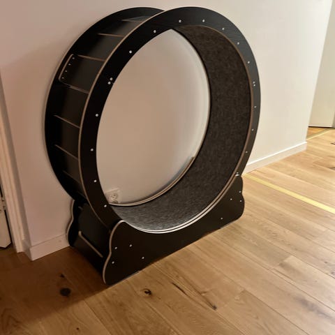 Helt nytt Katt-hjul träningshjul för katter. Hjulet har en robust stomme i svart trä och en insida klädd med grå matta för bättre grepp. Konstruktionen står på en stabil bas som gör att hjulet kan rulla fritt när katten springer i det. Produkten är lämplig för aktivering och motion av katt i hemmet.