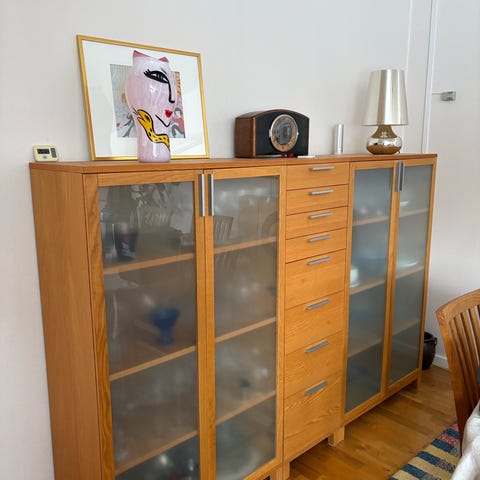 IKEA vitrinskåp i trä med glasdörr. Skåpet har flera hyllplan som ger plats för förvaring och exponering av exempelvis porslin, glas eller prydnadssaker. Passar i vardagsrum, matsal eller andra rum där man vill kombinera förvaring och insyn. Neutral träfärg som är lätt att kombinera med annan inredning.