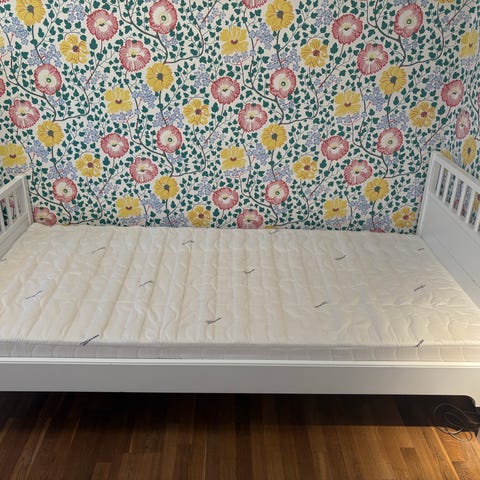 Barnsäng 165 cm lång och 80 cm bred. Kan säljas med madrass om man vill (utan tygskydd dock).