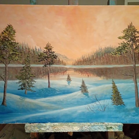 Tavla med motiv av vinterlandskap föreställande snötäckta berg, träd och ett rött skoterleds kryss i förgrunden. Färgerna domineras av vitt, grått och inslag av gult och rött, vilket ger en kontrast mellan bakgrund och detaljer. Passar som väggdekoration i exempelvis vardagsrum, hall eller sovrum. Målad på duk uppspänd på ram, avsedd för inomhusbruk.