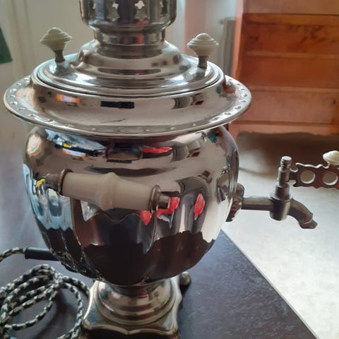 Samavar. Vattenkokare i metall. Klassisk modell med dekorativ fot och handtag. Avsedd för uppvärmning av vatten i hushållsmiljö. Passar för placering på bänk eller bord. Färgtonen är metallisk med ljusa detaljer på handtag och reglage.