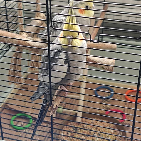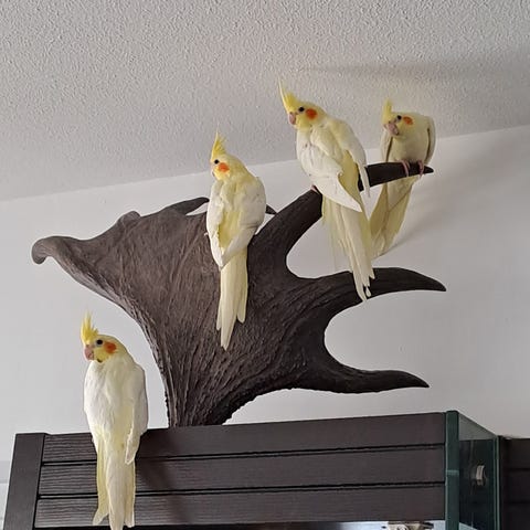 Väldigt lugna och fina fåglar. Två av dem är handtama och kommer upp på handen.