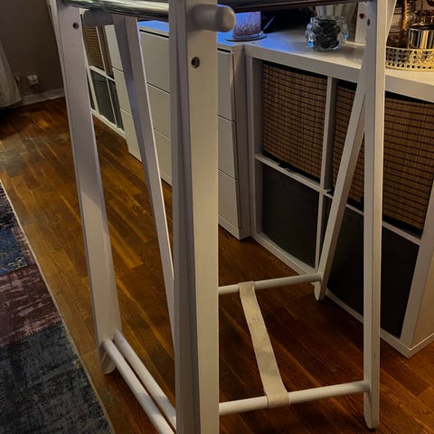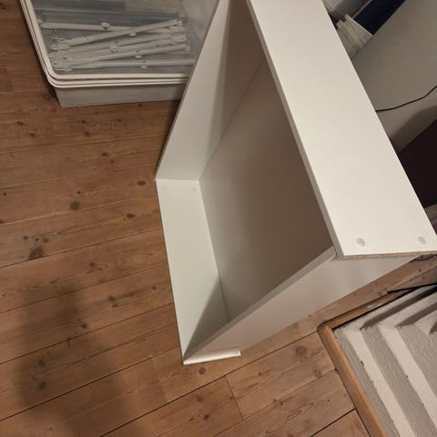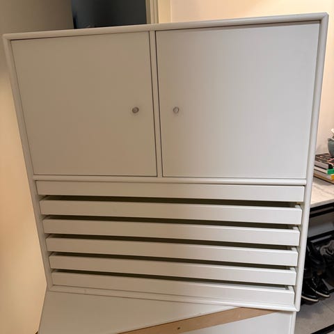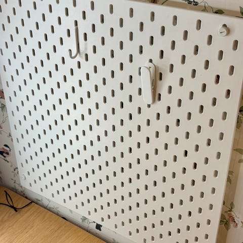 Fästs med skruv på väggen och kan anpassas efter vad man önskar förvara.