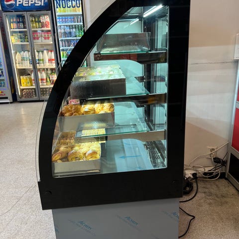 Infrico kylmonter med glasfront och flera hyllplan för exponering av kylda livsmedel eller drycker. Enheten har svart utsida, invändig belysning och nedre kylsektion. Utrustad med frontlucka/rullgardin för täckning när montern inte används. Lämplig för café, butik eller restaurangmiljö där kyld exponering behövs.