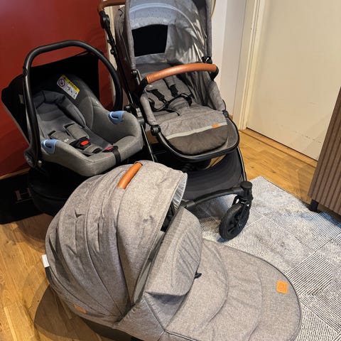 Kombivagnen kan användas från nyfödd med liggdel och senare med sittdel när barnet kan sitta själv. Babyskyddet är avsett för användning i bil enligt tillverkarens anvisningar. Alla delar har en enhetlig mörk färgsättning som passar både för vardagsbruk och promenader i olika miljöer.