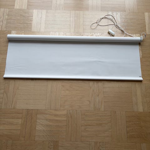 rullgardin i mörkläggande tyg, grå färg. Monterad på rullmekanism med dragkedja/snöre för upp- och nedrullning. Passar för fönster där man vill minska ljusinsläpp, till exempel i sovrum eller vardagsrum. Materialet är ett tätare tyg som hjälper till att skärma av ljus från utsidan. 119 cm bred., ca 300 cm lång.