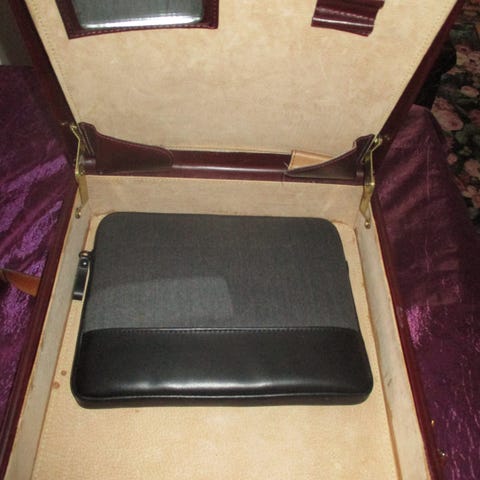 Portfölj i brun fuskläder. Väskan har hårt skal, bärhandtag och metallspännen med lås. Invändigt finns fack och remmar för dokument och mindre tillbehör. Passar för transport och förvaring av dokument och arbetsmaterial.