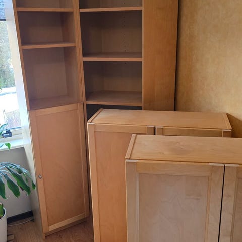 Två dörrar med gångjärn och två hyllplan till Billybokhylla i bra skick
