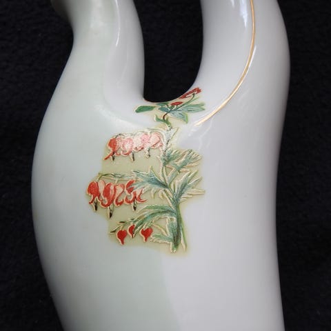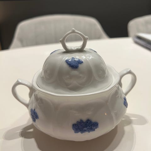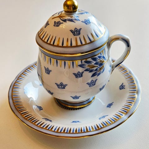 Äggkopp med fast fat i vitt porslin med blå dekor. Setet ligger i en fodrad presentask. Undersidan är märkt med text som anger tredje utgåvan 1978 och en upplaga om 3 500 stycken. Passar för servering av kaffe eller te samt som samlarföremål eller prydnad.