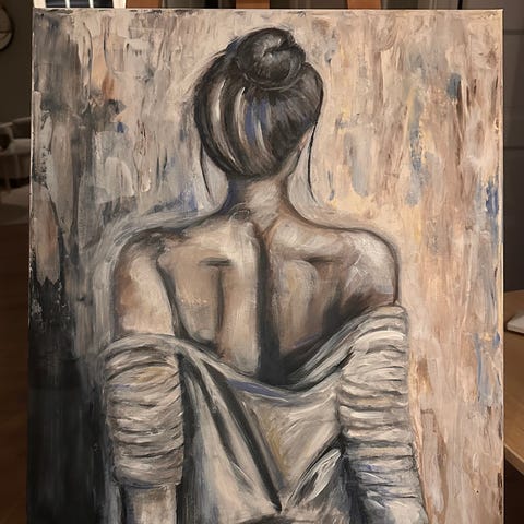 Målningen är kvadratisk och går i grå, vit och svart färgskala med inslag av ljusare toner.