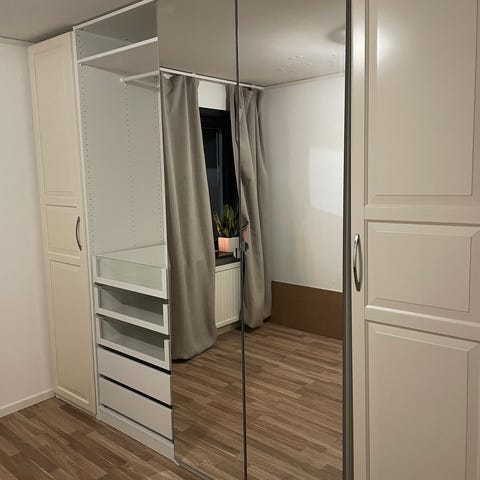Paxgarderob 150cm (två stommar 75 cm), höjd 236 cm, djup 35 cm. Vita stommar med inredning i vitlaserad ekeffekt. En dörr med spegel och andra i vitt glas.