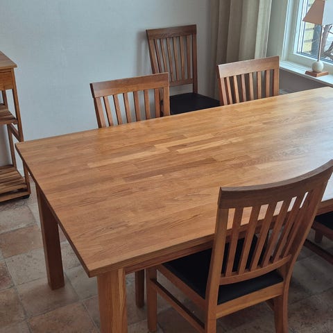 Rustikt bord med 6 st tygklädda stolar.
