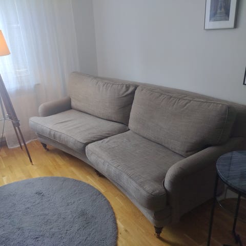 Väldigt fin och välvårdad Howard-soffa med tillhörande fåtölj i klassisk och tidlös design. En stilren, lättsvängd och mycket bekväm soffgrupp som passar lika bra i det moderna som det klassiska hemmet.