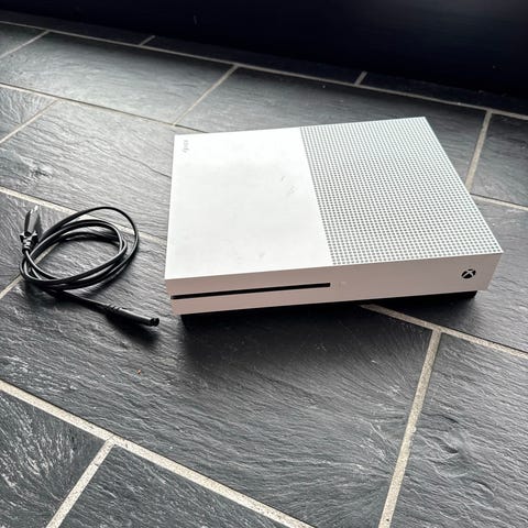 Xbox One S spelkonsol, en handkontroll medföljer samt ström kabel och hdmi.