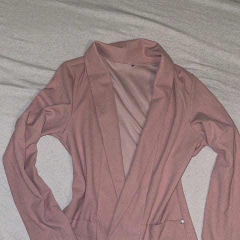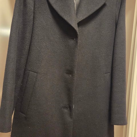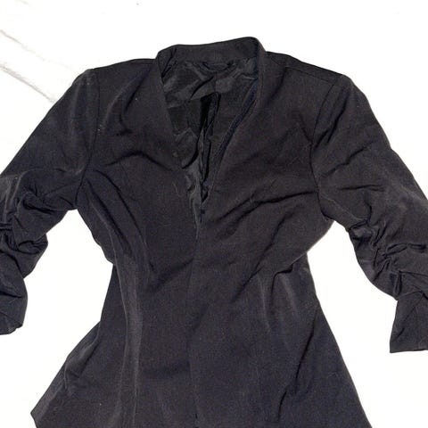 Svart knälång kavaj eller tunn jacka med öppen front utan knappar.