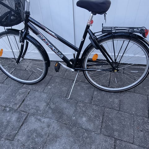 DBS landsvägscykel för kvinna med blå ram, utrustad med korg fram, kedjeskydd och skärmar. Cykeln har handbromsar och växlar på styret. Passar för väg- och stadscykling.