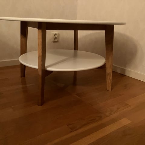 Runt stabilt soffbord. Svartbetsat med praktiskt förvaringshylla under.