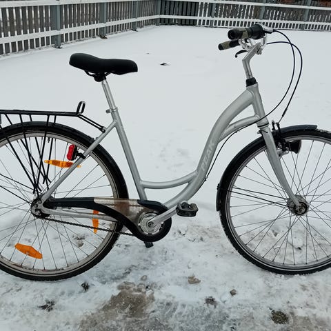 Hej. Säljer en fin damcykel av märket Velocity Live. 28 tum med 3 växlar. Cykelkorg. Lås med 2 nycklar. Reflexer. Ringklocka. Dubbelbottnade fälgar. Jättefina däck. Nya innerslangar. Batterilyse fram och bak. Hand och fotbroms. Cykeln är nyservad och nytvättad.