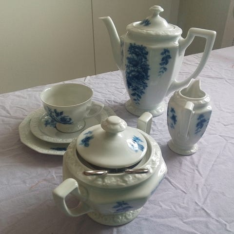 Arzberg Bavaria tekanna och gräddkanna i porslin. Setet är vitt med blått geometriskt mönster. Tekannan har lock med knopp och rund form med böjt handtag och pip. Gräddkannan har rundad form med handtag och pip. På undersidan finns Arzbreg stämpel. En skada syns vid öppningen på tekannan enligt bild.