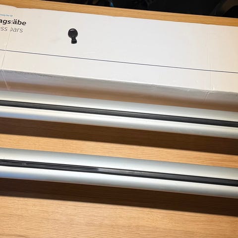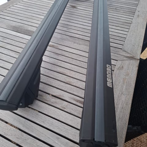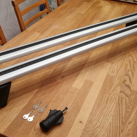 Takräcken i aluminium i färgerna svart och silver. Består av två parallella räcken med gummilist i mitten för bättre grepp. Passar för montering på bilens tak för transport av exempelvis takbox, cykelhållare eller annan last som är avsedd för takräcken.