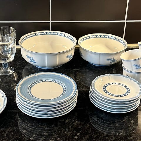 Porslinsservis med kanna, sockerskål och ovalt serveringsfat. Alla delar är i vitt porslin med handtagsdetaljer och dekor i form av rosa blommor och gröna blad.