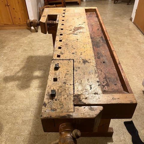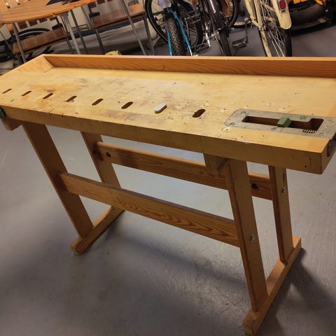 Snickarbänk i trä med hopfällbart underrede. Bänken har massiv träskiva med hål för bänkhakar samt integrerade skruvtvingar i kortsidorna för fastspänning av arbetsstycken. Underredet är utfört i trä med krysstag och är försett med hjul för att underlätta förflyttning när bänken är hopfälld. Lämplig som arbetsbänk i snickeri, hobbyverkstad eller garage där man behöver en stabil men flyttbar arbetsyta.