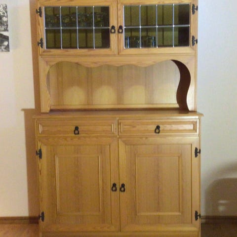 Vägghängt vitrinskåp i furu med två glasdörrar. Skåpet har träramar med spröjs och runda trähandtag på dörrarna. Gångjärn i metall på sidan. Ovanpå skåpet finns en plan yta som kan användas för förvaring eller dekoration. Passar för förvaring och exponering av glas, porslin eller andra mindre föremål i kök, vardagsrum eller hall.