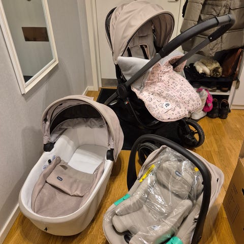 Barnvagn säljes. På köpet får man ett babyskydd som är okrockad.