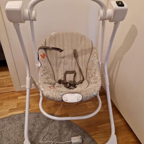 Gungfunktionen är avsedd för barn upp till 9 kg och kan ställas in i 8 olika gunghastigheter samt 3 tidsintervaller. Stolen spelar lugnande ljud och musik – fågelsång, vattenljud eller 12 olika melodier. Avtagbar och tvättbar sittdyna medföljer. Stolen är enkel att fälla ihop och kan drivas både med batteri eller elsladd.