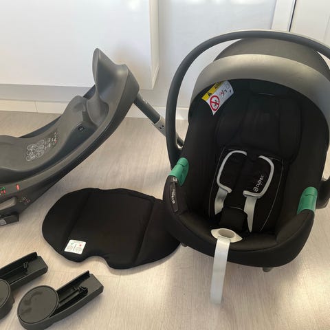 BRIO babyskydd bilbarnstol för barn i storlek 0–13 kg. Modellen är bakåtvänd och monteras i bilen med basen som syns på bilderna. Babyskyddet har bärhandtag, justerbar sele och vadderad insida. Klädseln är i svart tyg med ljusa sömmar. Passar som första bilbarnstol för spädbarn upp till cirka 13 kg, både för vardagsresor och kortare bilfärder.