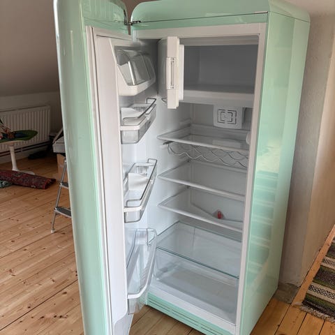 Smeg kombiskåp kyl och frys i röd färg. Skåpet har kyl ovanför frys med separata dörrar och horisontella metallhandtag. Passar för förvaring av matvaror i kök eller extra förvaring i exempelvis grovkök eller förråd. Retroinspirerad design med synlig Smeg-logotyp på ovandelen.