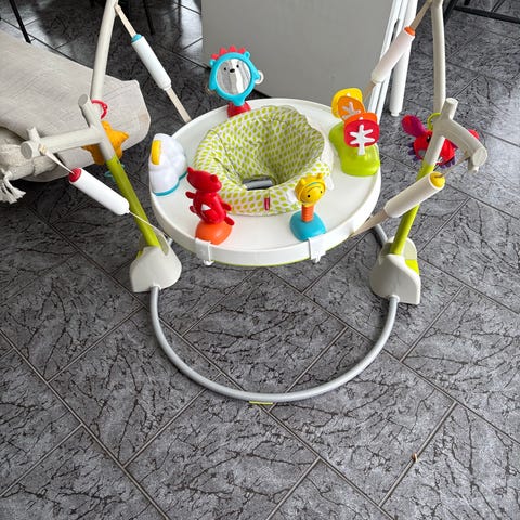 Explore & More Hoppgunga från Skip Hop är en aktivitetsgunga som underhåller och belönar din bebis med hjälp av ljus och musik. Hoppgungan räknar alla hopp – varje gång din bebis passerar 100 hopp, belönas hen med applåder och färgglada lampor. Sittdelen kan rotera 360 grader så att den bebis kan snurra i alla riktningar för att utforska sin omgivning. När lekstunden är över fäller du enkelt ihop hoppgungan för smidig förvaring.