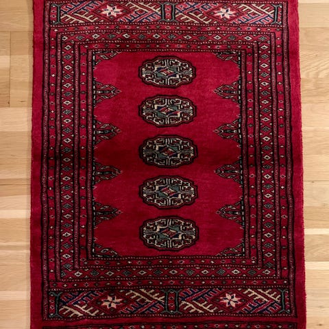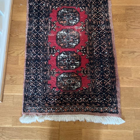 Vacker handknuten orientalisk matta i Bokhara-inspirerad stil med rött bottenfält och traditionellt mönster av små geometriska medaljonger. Mattan är cirka 93cm lång och 64 cm bred och är perfekt som hallmatta, vid sängen, i ett mindre rum eller som dekorativ detalj i hemmet. Den är i bra skick med klara färger. Normalt slitage förekommer främst på fransarna, men inga större fläckar eller skador finns. Mattan är tidlös och ger både värme och karaktär till rummet. Skicka bara meddelande ifall ni undrar något mer