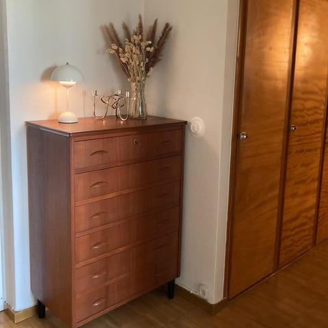 över hundra år gammal byrå som är superrymlig. färgen flagnar lite överallt och är lite av ett renoveringsobjekt men vi har haft den som den är.