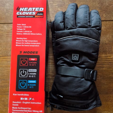 OSMO handskar för herr i storlek M. Handskarna är svarta och tillverkade i polyester. De har lång mudd, justerbart spänne runt handleden och dragkedjeficka på ovansidan. På ovansidan finns även en knapp för värmereglering, vilket indikerar att handskarna är uppvärmningsbara med batteri. Insidan är isolerad med 3M Thinsulate enligt etiketten. Lämpliga för kallt väder och utomhusaktiviteter där extra värme runt händerna behövs.