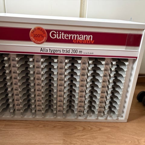 Trådrulleställ i trä med flera pinnar för förvaring av trådrullar. Överst finns en nåldyna i rött tyg för nålar och knappnålar. Stället är avsett för organisering av sytråd och sybehör och kan placeras på bord eller hylla i syrum eller hobbyhörna.
