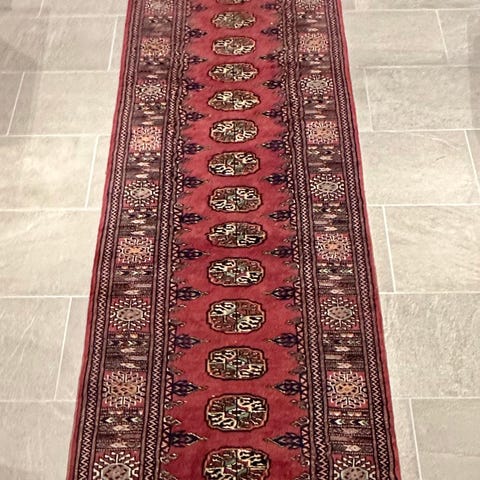 Vacker handknuten orientalisk löpare i klassisk röd färg med traditionella geometriska motiv (Bokhara-stil). Mått ca 100cm lång och 33cm bred. Fransar i båda ändar. Perfekt som gångmatta i hall, kök, vid säng eller som dekorativ detalj i mindre utrymme. Tidlös design som passar både klassiskt och modernt hem. Den är i bra skick.