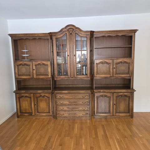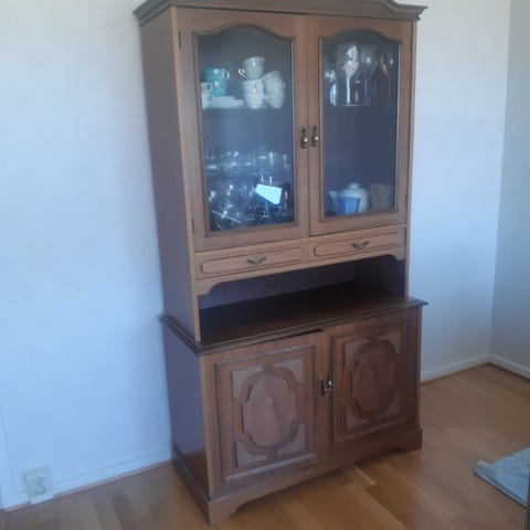 Vitrinskåp / sideboard i brunt trä med överdel och underdel i en enhet. Överdelen har öppna hyllplan i mitten samt två vitrindörrar med glas och rutmönstrade spröjs på sidorna. Underdelen har flera lådor i mitten med metallhandtag samt skåpsförvaring på sidorna. Möbeln ger både förvaringsutrymme och möjlighet att visa upp porslin, glas eller andra föremål i vardagsrum, matsal eller kök.