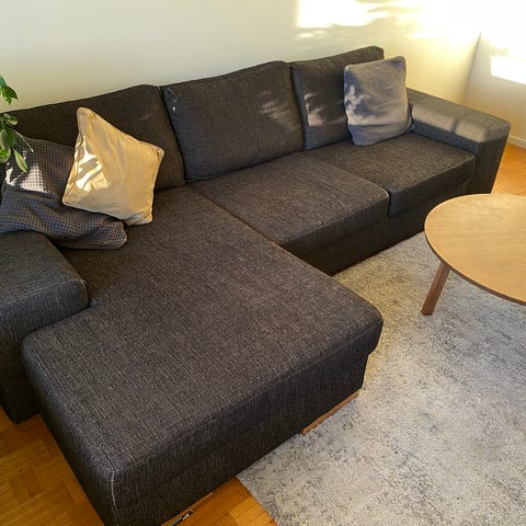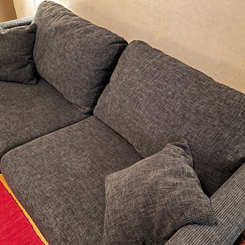 Bakom ena ryggkudden på armstödet är tyget lite upprepat, inget som syns och får nog att laga.