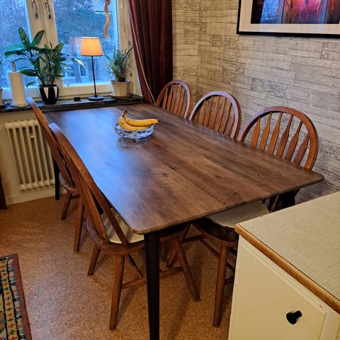 Gediget mörkt bord med plats för 8 personer som står i kontorslandskap.